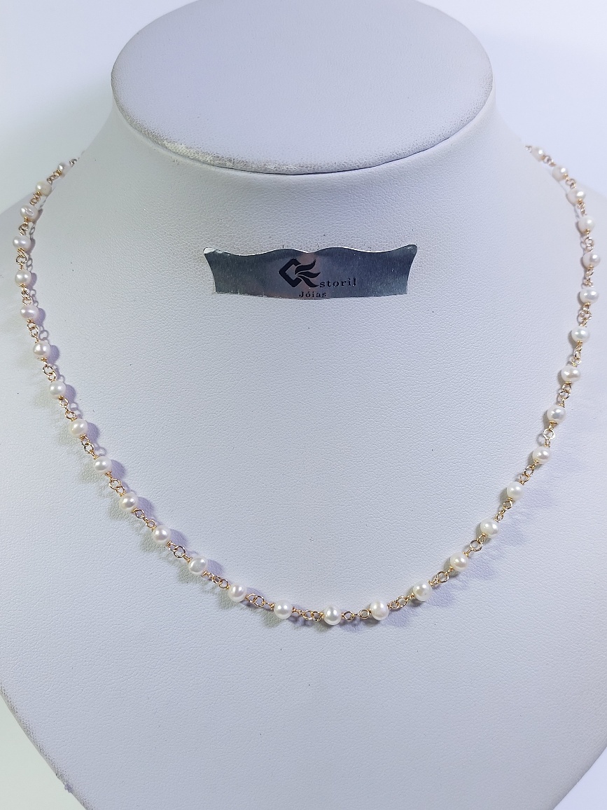 Fio elegante em ouro amarelo de 19,2kts com aplicação de 10 pérolas sintéticas de boa qualidade de 3mms. Tem aproximadamente +/-1,9grs de peso total e 43cms de comprimento.