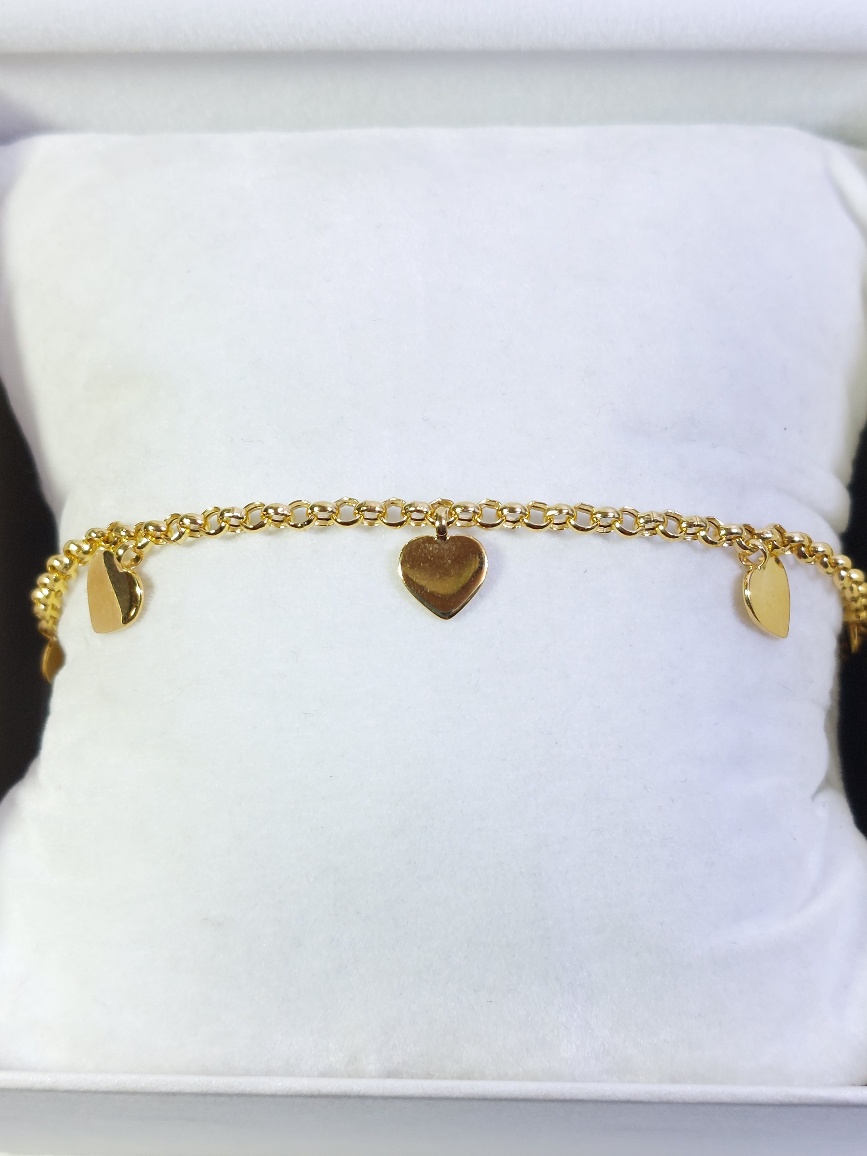 Pulseira em ouro de 19,2kts com malha cadeado redondo e 5 corações aplicados intercaladamente. Tem 18cms de comprimento, com os corações a medir 5mms e pesa +/-3grs.