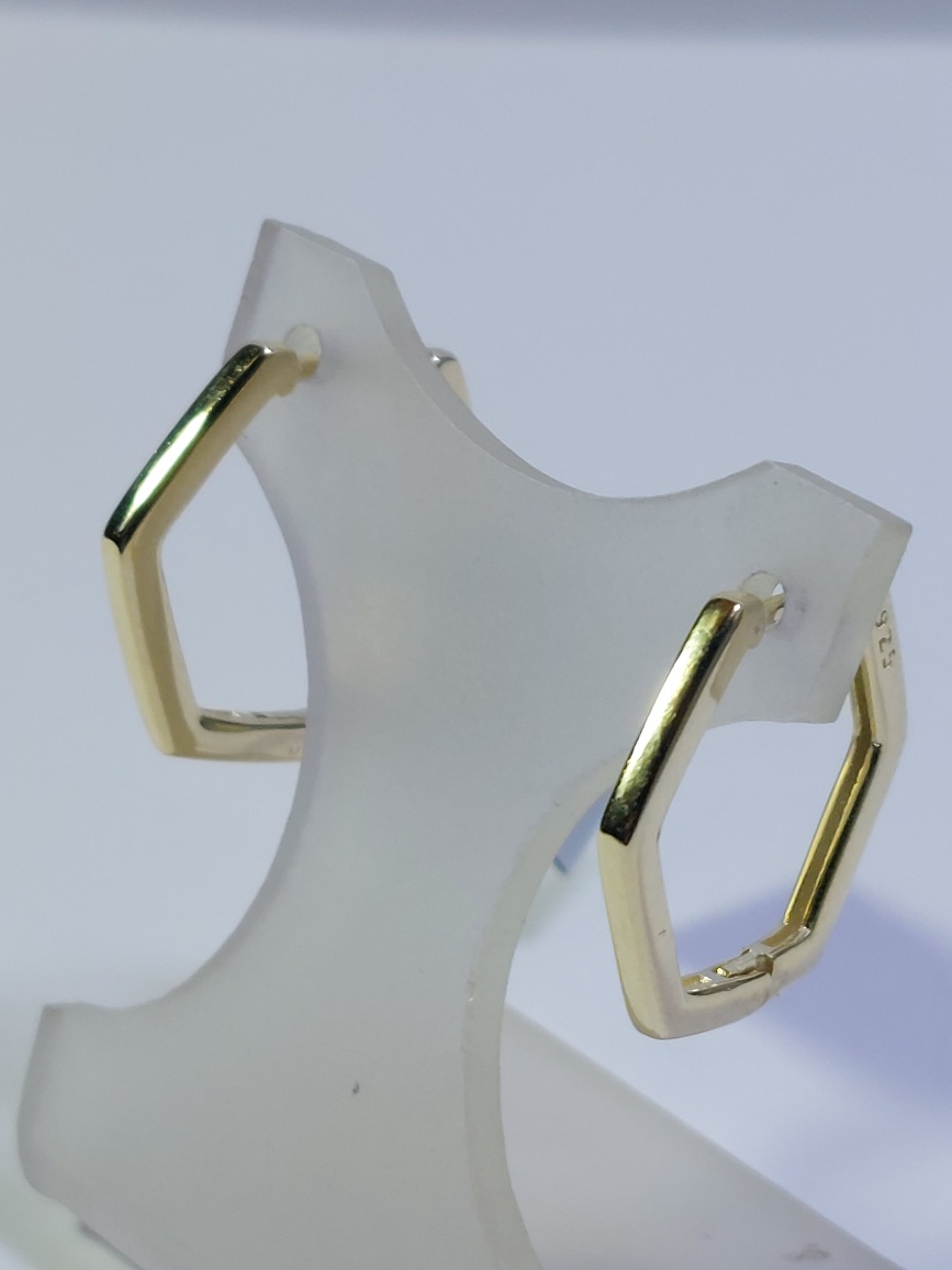 Argolas de tira retangular em prata dourada e fecho de espigão e mola. Possuem 16mms de diâmetro e largura de +/-4mms. Pesam +/-2,7grs.