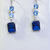 Brincos em prata pendentes, em gancho com zircónias em tom azul e zircónia retangular na extremidade.